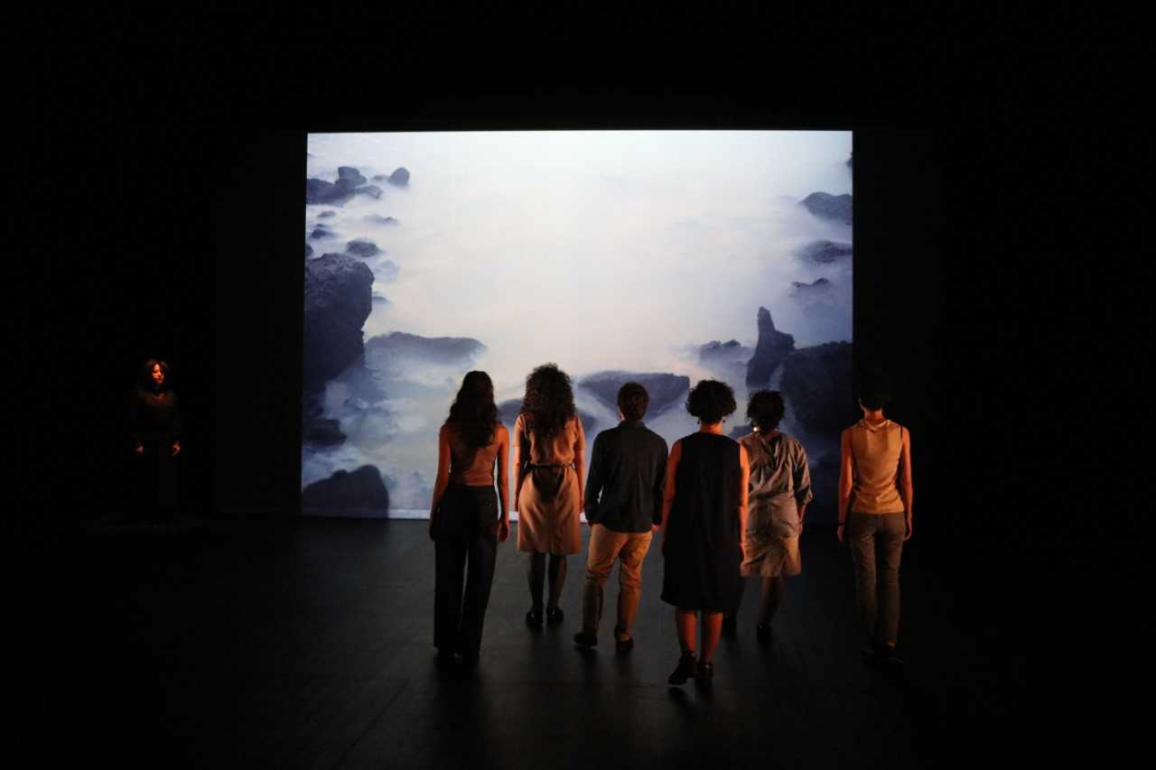أثناء إلقاء الجوقة الجماعي، تكتب المشاركات المسرحيات على خشبة المسرح كأنهن يكتبن على لوح الطبشور، تعليمات التصرف لعبور الاعتقال على قيد الحياة: